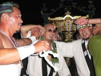 大汗かいてお神輿をかついでいる。
