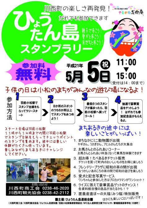 川西町小松地区のまちなかをスタンプを集めながら巡るひょうたん島スタンプラリーが開催されます。途中途中で昔の遊びを楽しんだりミニ動物園で遊んだり、お得なお買い物をしたり、ゆっくりゆったり小松のまちを楽しみながら歩いてください。スタンプを集めてゴールするとはずれなしのくじ引きに挑戦。お得で楽しい一日をお過ごしいただけます。