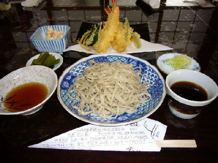 写真は荘輔そば自慢の逸品「天もり」です。自家製の手打ちそばにサクサクの揚げたての天ぷらがついて1200円です。