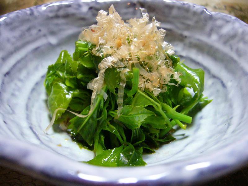 川西町上小松の老舗割烹「喜楽」。先日、懇親の場があり、出席したら、写真のうこぎ新梢。以前もお知らせしたが、川西町洲島の和田さんが作っているもの。今の時期、おひたし類が少ないので、重宝しているとのこと。