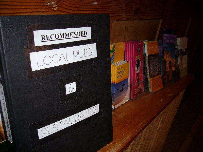 さて、B&Bスタイルの宿に泊まった客は、夕食はどうしているのか、という点も気になる。私たちは毎晩のようにパブに繰り出したのだが、他の多くのゲストも近くのパブに出かけるようだ。最初に泊まった民宿には、廊下の一画にその宿推薦(話によると提携していることもあるらしい)のパブやレストランを紹介するスペースがあり、地図や電話番号のほか、メニューまで見ることができるようになっていた。