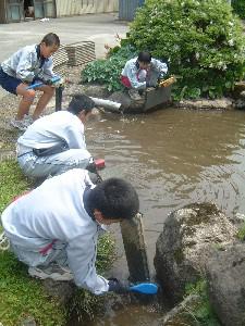 午前中は、池で苗箱を洗いました。