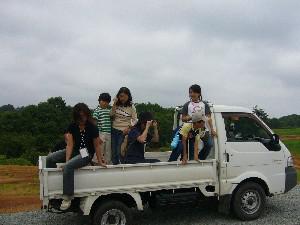 阿部さんのトラックに荷台に乗って移動。玉庭放牧場は面積が200ヘクタールあり、造成中の牧草地に行って説明を受けました。