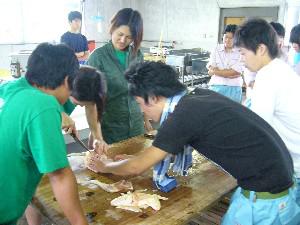 [画像][画像]高校生からも技の指導をいただきました。[画像] イキのいいレバーを取り出しました。[画像][画像] 最後の行程で「足のケン」を取るのですが、指とつながっていて、高校生はこれで遊ぶそうです。[画像][画像] この後、畜舎を案内してもらいました。裁いた肉は今日の食材とします。