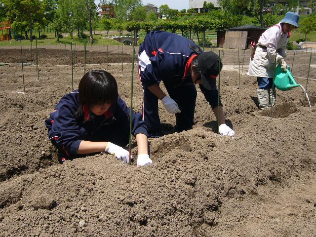 川西町では、70名の生徒が、10軒の農家での作業と川西ダリヤ園での球根植付などを手伝いました。