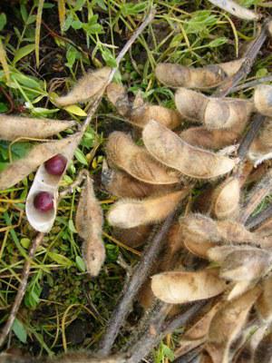 見つけました。乾燥して茶色になったサヤをあけると、かわいい紅色の大豆が顔を出してくれました。