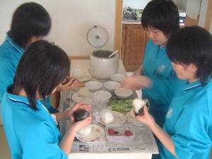 もうすぐお昼です。受入先の須藤フミさん(大字吉田)のトレーラーハウス内では、梅干入りコシヒカリのおにぎりつくり。