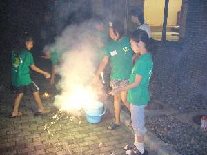 写真は夕食後に行われた花火の様子。このほか、電灯をたどってのかぶと虫さがしなども行いました。
