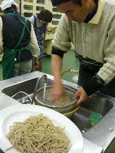 写真は、最後の行程、そばを洗うシーン。ここにも気配りが必要で、ゆであがったそばを流水につけ、そばの熱が下がった段階で、すばやくヌメリをとる・・冷めないうちにすると、そばが切れるとか・・
