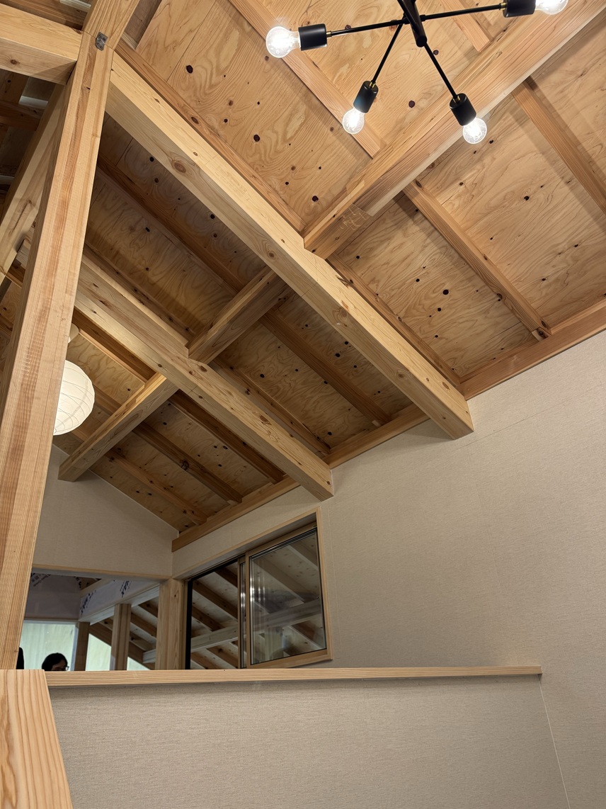 こちらの合板表しの天井は構造躯体をそのまま仕上げている状態ですが、このような仕上げも屋根断熱でやったこともありますが、久しぶりに見るといいなと思いました。