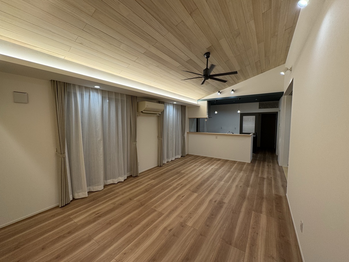 久しぶりの平屋の内覧会で勾配天井に桐材を使用して、調質効果を高めたデザイン性のある空間に仕上がりました。