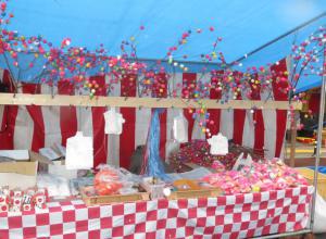 縁起物の初飴や団子木、臼、杵、まな板などの木工家庭用品などの