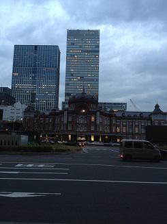 レンガ造りの東京都と現代を象徴する大きなビル、違和感がありつつも