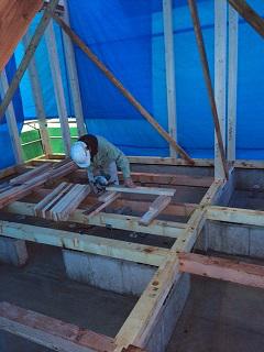 まずは1階の合板受けの施工、つづいて2階床合板敷きを手伝いました。
