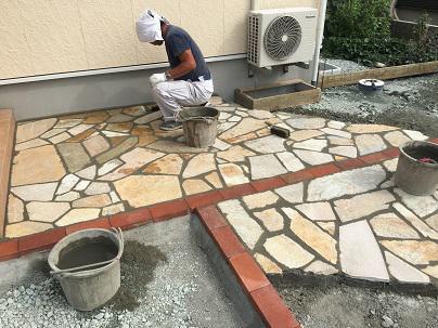 レンガブロックを敷き並べて目地部分にアクセントのラインを施工しております。