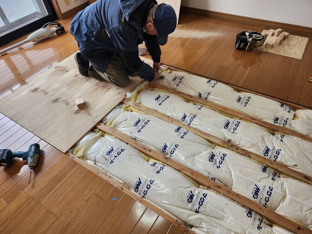 床を剥がし、下地根太を修正補強しました。