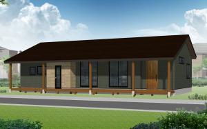 玄関ポーチからテラスまで続く長いウッドデッキが特徴の平家。