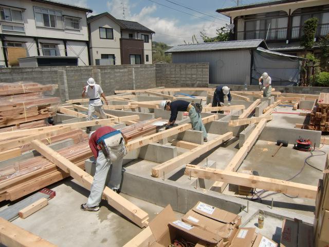 大工さんより土台の敷きこみが始りました