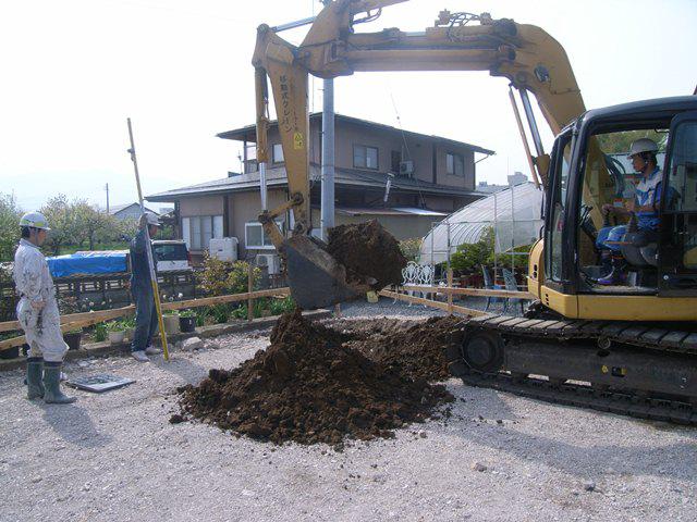 事前に地盤調査を行い、地盤の弱い部分の土を改良土に置き換えしています。