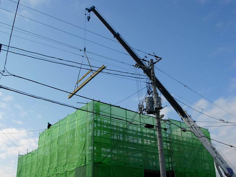 まずは屋根材をクレーンで移動