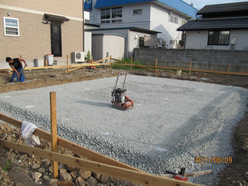 柱状改良の上を、床掘をしてベタ基礎の耐圧盤づくりです。