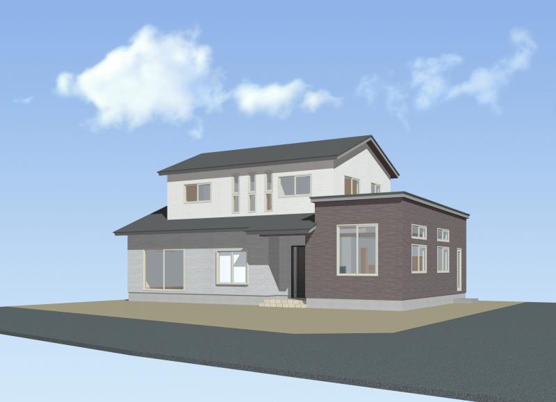 外観は三角の屋根と凹凸間のある形状に、同じデザインの外壁を3色使いし立体感を