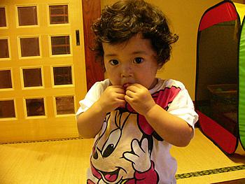 >「パーティボックスに入っていたさくらんぼを早速食べる娘。種が気になるみたい。」<