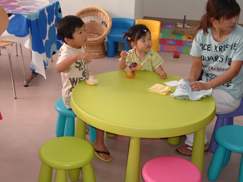 子どもたちが、安心して座れる、テーブルセットがあります。カラフルなイスを目がけて、みんなにこにこでやって来ます。