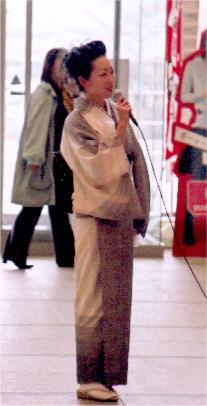着物ファッションショーの司会は、斬新な着物ファッションをも自ら提案する、上山市在住の着付講師・小笠原栄子さん。