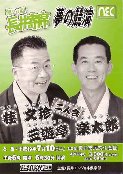 来たる7月10日、長井市民文化会館にて、第24回の長井寄席〜《桂文珍&三遊亭楽太郎》二人会が行われます。