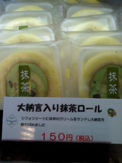 シフォンシートに、抹茶のクリームをサンドし大納言をちりばめ巻き上げました。