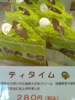 抹茶スポンジに、抹茶入り生クリームを2段サンドし上段には、大納言をちりばめました。上には、そぼろをかけました。