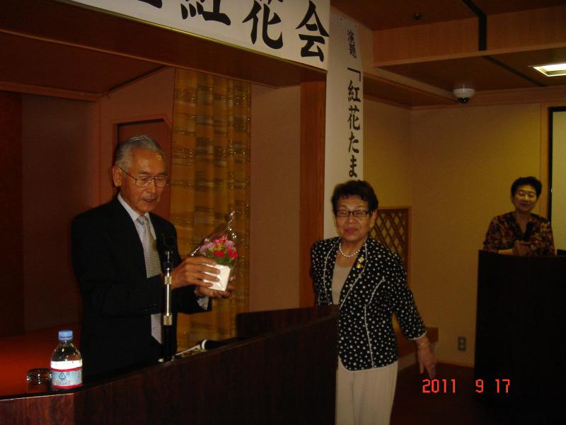 料理に対する先生の力強い姿勢がVTRを通して私たちに伝わってきました。紅花 は映像にはありませんでしたが、紅花も菊花も同じこと。先生の箸裁きや色あわ せの見事さに、みなさん ため息をついていました。素晴らしかったです。