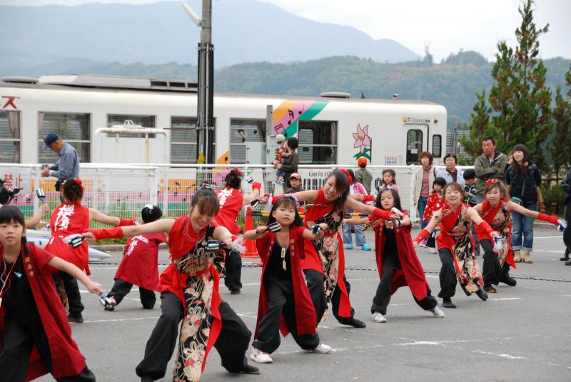 ▼荒砥駅では、よさこいソーランや保育園児のバルーンで楽しませてくれました。