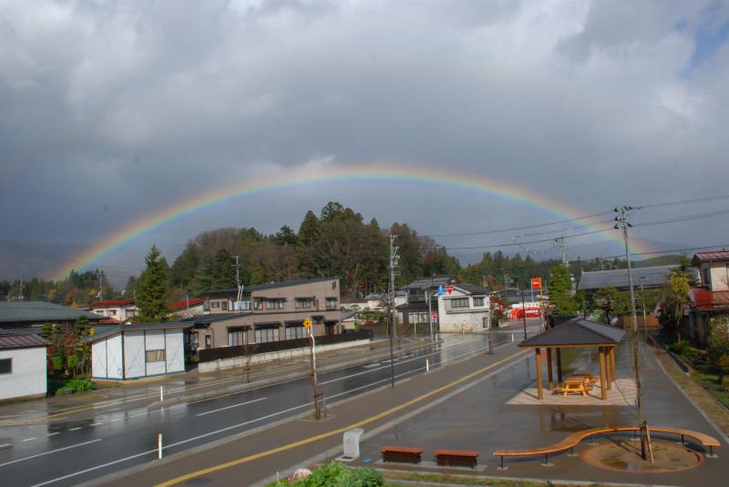 ▼白鷹町の鮎貝八幡宮の杜の上に虹の架け橋でした。