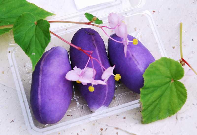 <写真は、秋海堂の花を対比させて、アケビの新鮮色を紹介しています。>