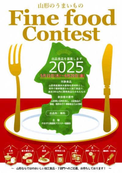 山形のうまいもの「ファインフードコンテスト」への出品者を令和7年6月20日(金)まで募集しています。 過去3年以内に商品化された、県産農林水産物を原材料とした加工食品を製造・販売している方が対象です。 今年は、山形県で初めて果樹の苗木が植えられてから150周年となるのを記念して、「やまがたフルーツ150周年賞」を新設しました。皆さん、ぜひご応募ください!