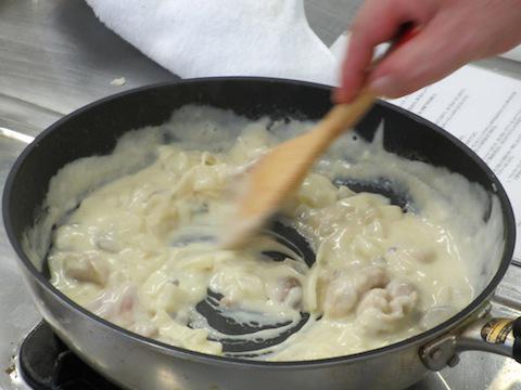 鶏肉とタマネギをオリーブ油で炒めた後、スープと牛乳を入れ、