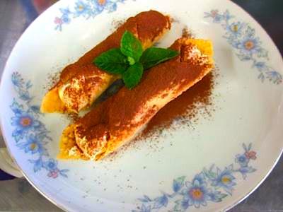 9、皿に盛り付け、上にココアをかけ、ミントで飾る。