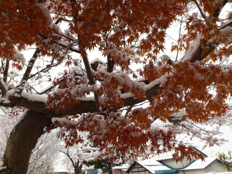 まだ紅葉が落ちきらないままの初雪で