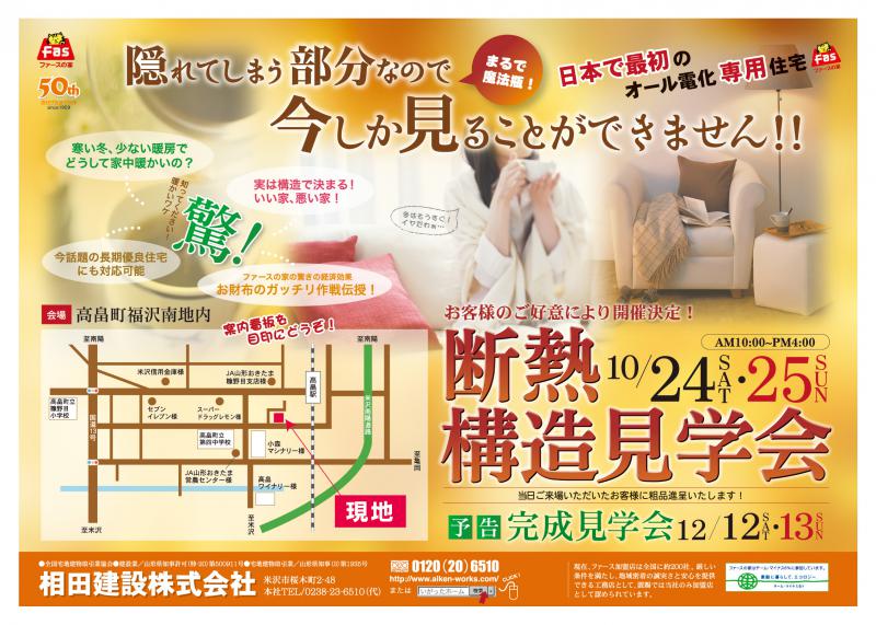 来る、10/24(土)と25(日)の10〜16時、高畠町で弊社住宅建築工事現場の見学会を開催しますが、その案内チラシを高畠町、南陽市に新聞オリコミするのですが、いち早くその内容をご覧入れます!