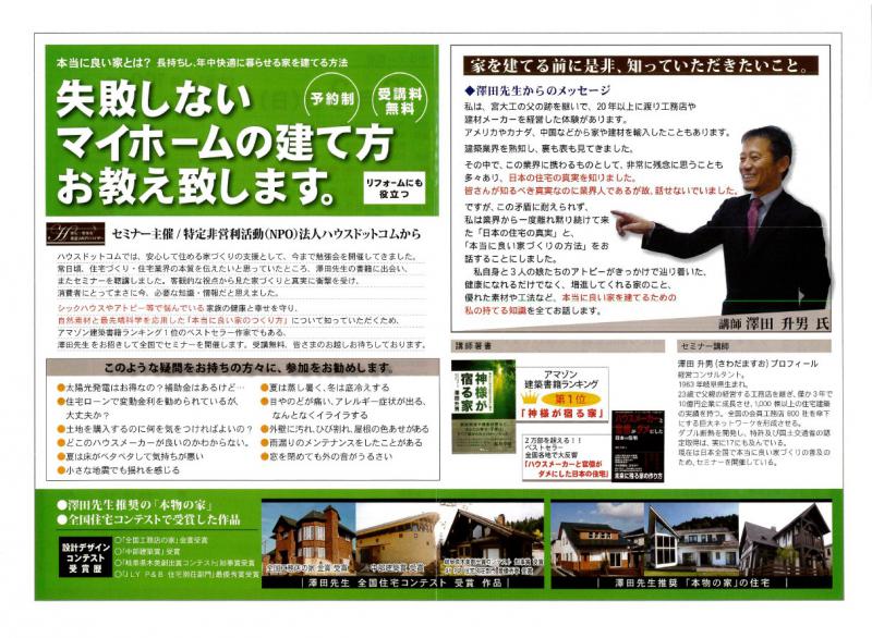 来る6月3日(日)、あの澤田升男氏の住宅セミナーが山形のビッグウィングで開催されます。全国を飛び回り住宅を通じて世直しをしようと精力的に活動されています。