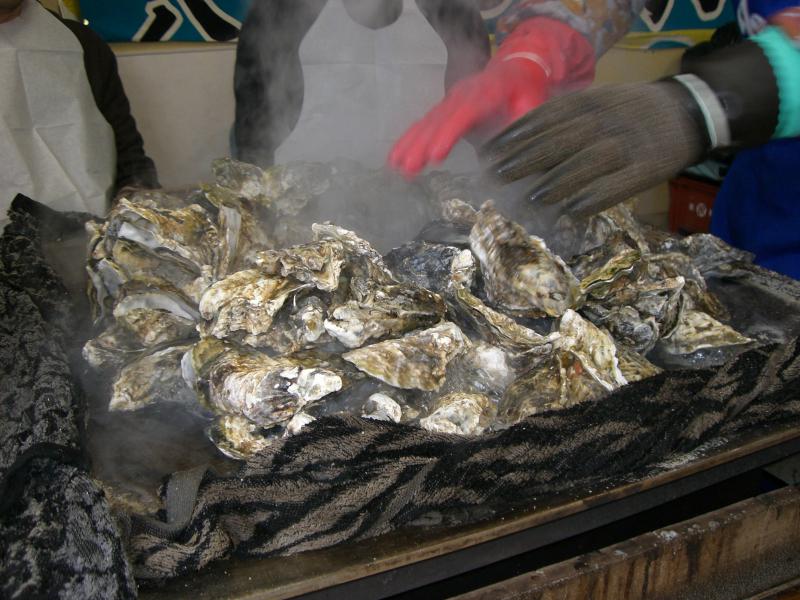 一斉に鉄板の上に牡蠣がスコップで運ばれてくる。