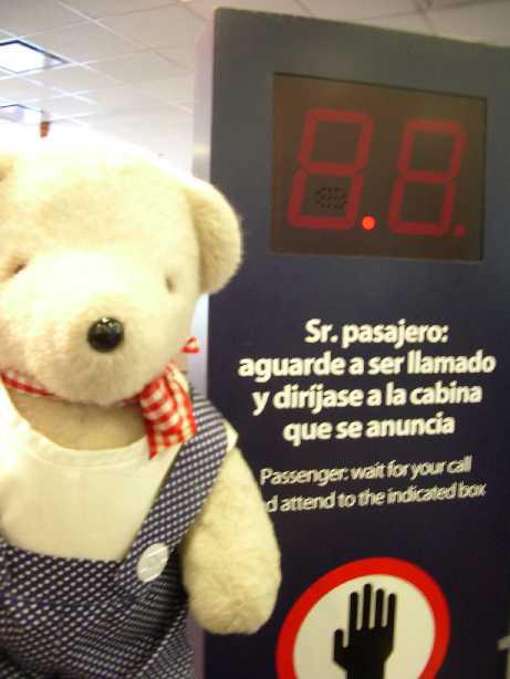 出国審査場では、ボクの脇にある機械に、手続きするカウンターの番号が表示されるくまから、それに従って順番に前に進むくまよっ♪