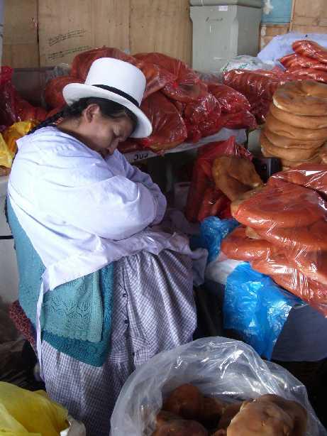 ペルーの女の人はこのオバちゃんがかぶってるような背の高いお帽子をかぶってたくまよっ♪