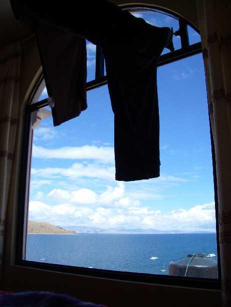 ▼洗濯物越しに眺めたチチカカ湖。 (^- ^)p