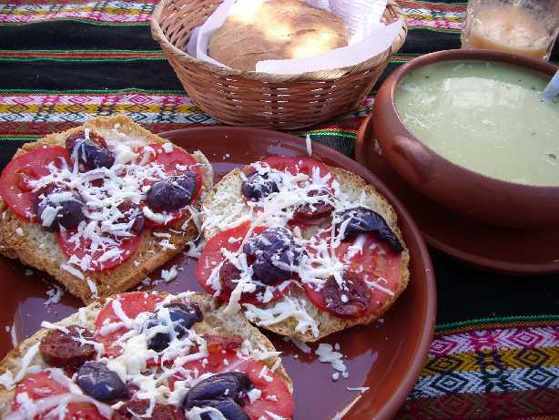 トーストしたパンに、トマトとオリーブ、チーズがのったオープンサンドイッチ♪♪♪
