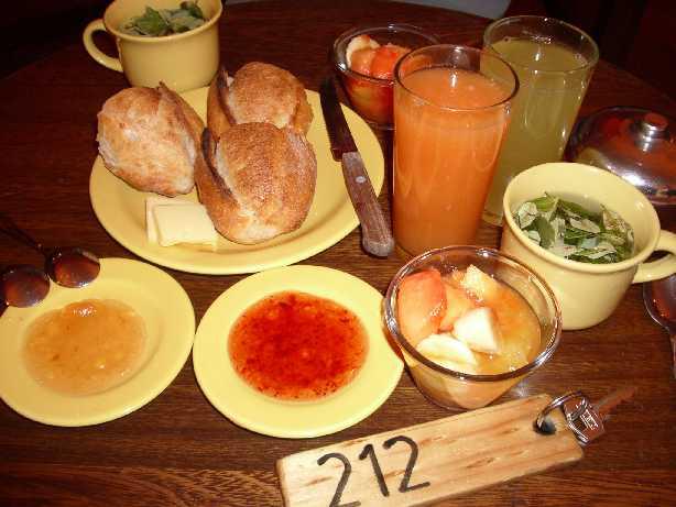 パンとフレッシュジュースに、フルーツとお茶…といういたってシンプルな朝食くまけど、朝にあったかいお茶を飲めるのは嬉しいくまよねぇ〜っ♪