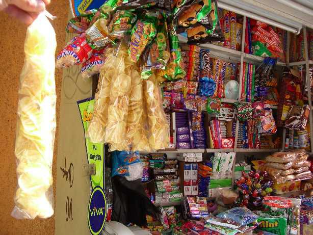 街角の売店で、こうして細長い透明のビニール袋にポテトチップスを入れて売られてたくまっ♪