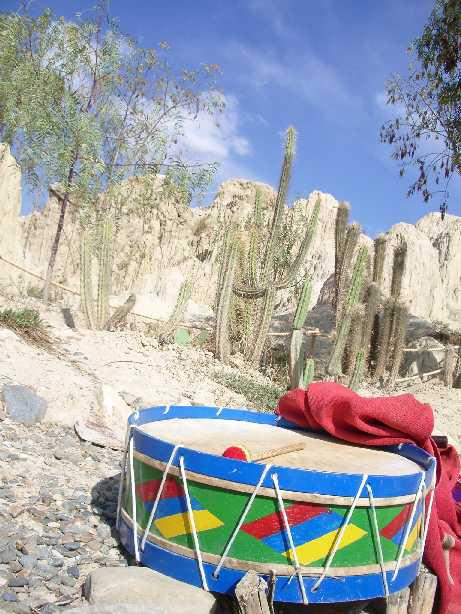 青空の下の乾いた土地にサボテンが生えてて、その色味のない土地にアクセントを添えるようなカラフルな太鼓♪♪